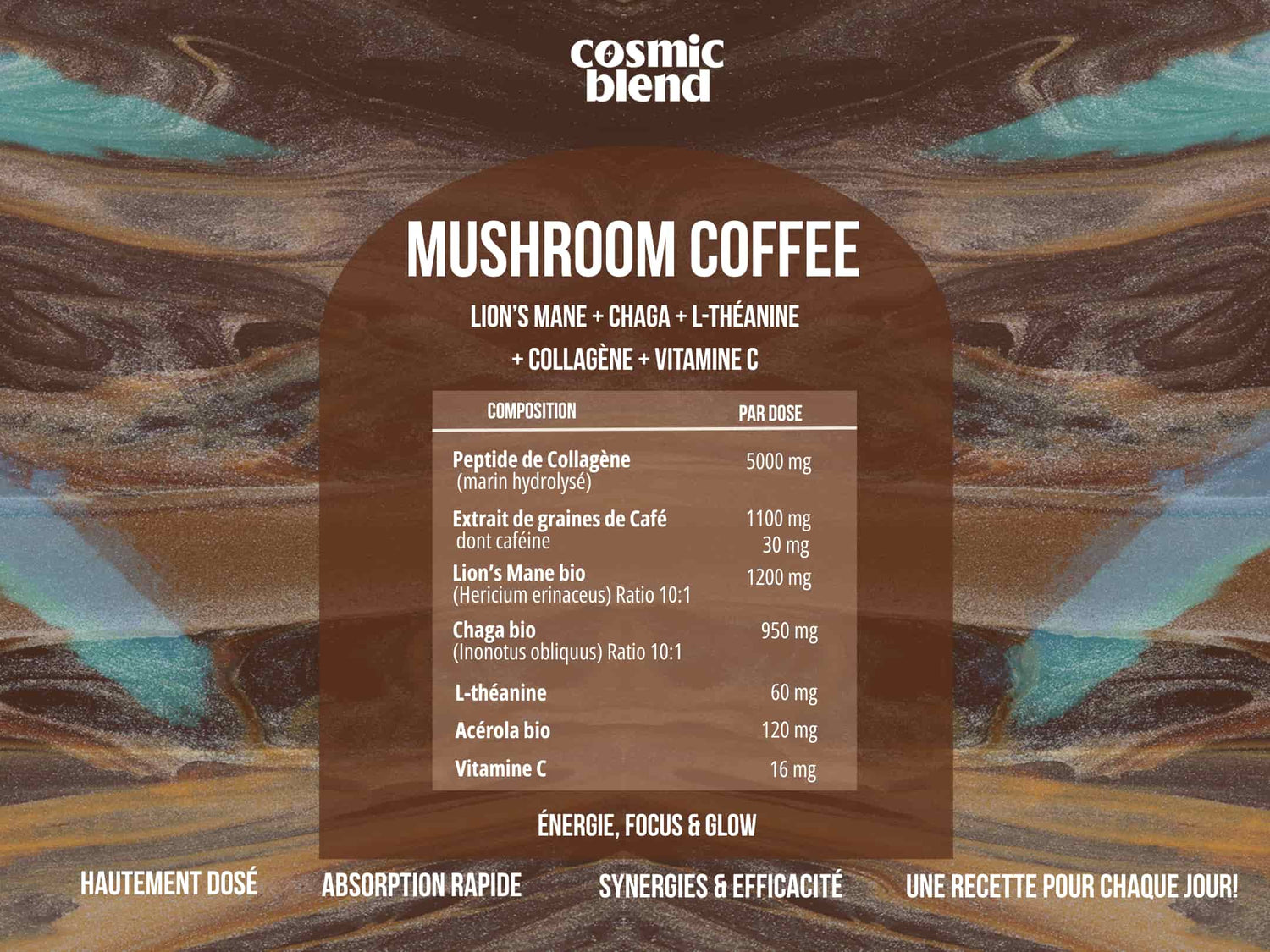 Mix champignons & nootropes exclusif Cosmic Blend: Lion's Mane (Hericium erinaceus) Chaga (Inonotus obliquus), Acérola (Malpighia glabra), L-théanine